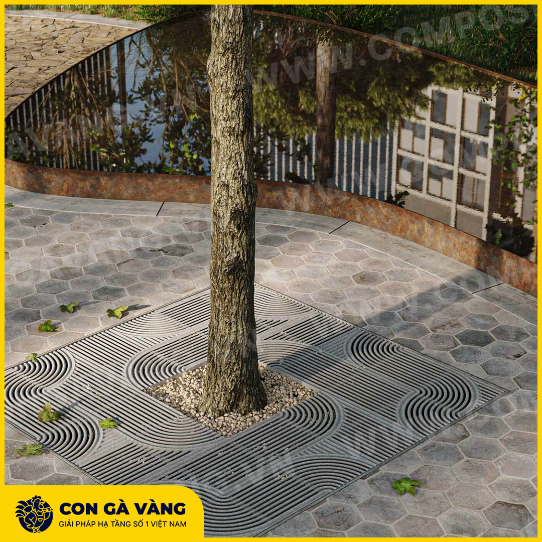 Mỗi tấm ghi bảo vệ gốc cây đều được làm từ 95% cốt liệu tự nhiên, chỉ có 5% là Polyme tổng hợp. Sự kết hợp này giúp sản phẩm bền vững hơn, chắc chắn hơn và trong tự nhiên hơn.
