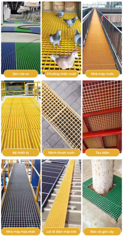 Sản phẩm được ứng dụng rộng rãi trong các nền tảng làm việc, bệ thiết bị, sàn khoan, lối đi chiếu sáng trong các ngành công nghiệp dầu khí, hóa chất, điện lực, sản xuất giấy, in ấn và nhuộm, mạ điện, thăm dò biển, xử lý nước thải và nhiều ngành công nghiệp khác. Đây là sản phẩm lý tưởng trong môi trường ăn mòn, đồng thời cũng phù hợp với các công trình xây dựng dân dụng.